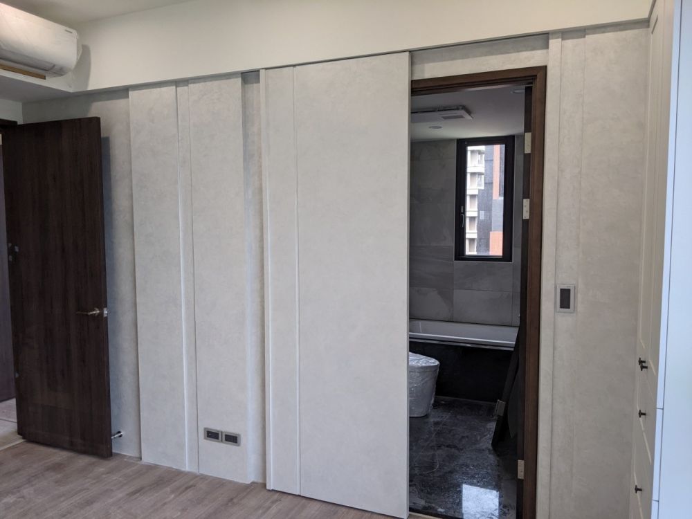 6.臥室隱藏門:主臥內的浴室門片以隱藏設計呈現,並加入線條溝槽與藝術漆修飾。