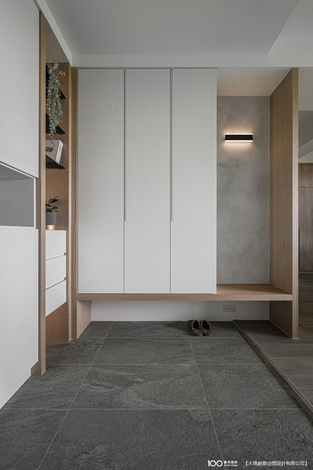 1.玄關:置入櫃體同時以不同地坪材質區隔空間。