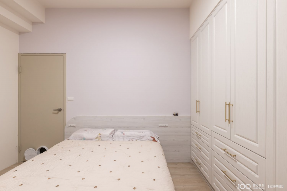 前面有提到,我們不喜歡普通沒創意的櫃門設計,希望有點不一樣的變化,設計師以線板造型搭配金色把手,結合圓弧玻璃展示櫃,以淡粉色作為牆面跳色,搭配Order奧莉微亞綠色床墊和優渥日落實木床架,讓我們的主臥好睡又有質感,超滿意的!對了~那個貓門是我們上網買的材料,自己DIY的~