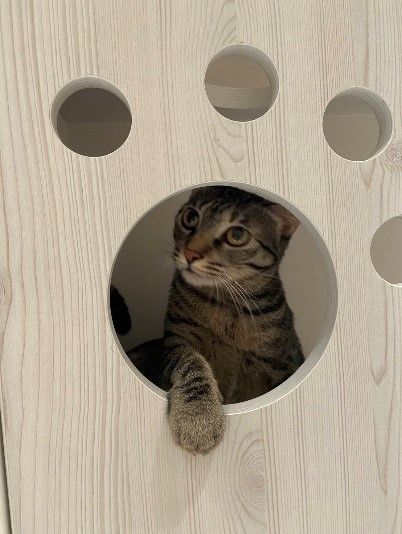 電視牆做了鏤空貓腳印,這也是從網路上看到的小設計,打造貓咪可以跳上跳下的跳台,原本想說如果貓咪不喜歡,也能充當收納架,但剛好四貓都處在調皮搗蛋的年紀,正好讓他們發洩旺盛的精力,每天看他們在這鑽來鑽去超療癒!